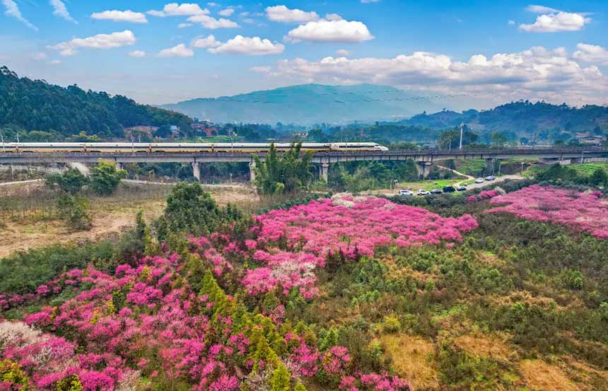 永川大安街道的红梅近日迎冬绽放自1月27日起漫山红梅如霞似锦构成一幅生动的生态画卷 红梅谷占地面积约200余亩以美人梅、宫粉梅为主要品种花色红粉交织花期预计从1月下旬持续至2月...
