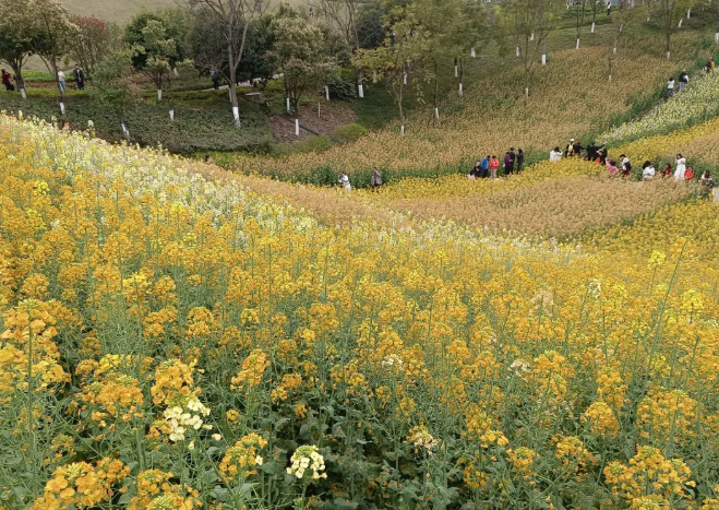 三月的春风吹得暖酥酥的,加速了想去大自然中撒欢儿的心。在两江新区的溉澜溪体育公园,有一个2.1万平方米的巨型花田,就像打翻的春日调色盘,金黄、橙黄、浅紫、奶白的油菜花交相辉映,...