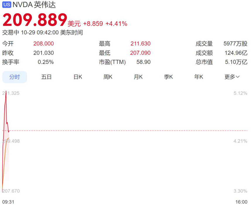 29日晚,美股三大指数集体高开。截至发稿,道指涨0.44%,纳指涨0.62%,标普500指数涨0.31%。 值得注意的是,英伟达涨超4%,总市值达到5.1万亿美...