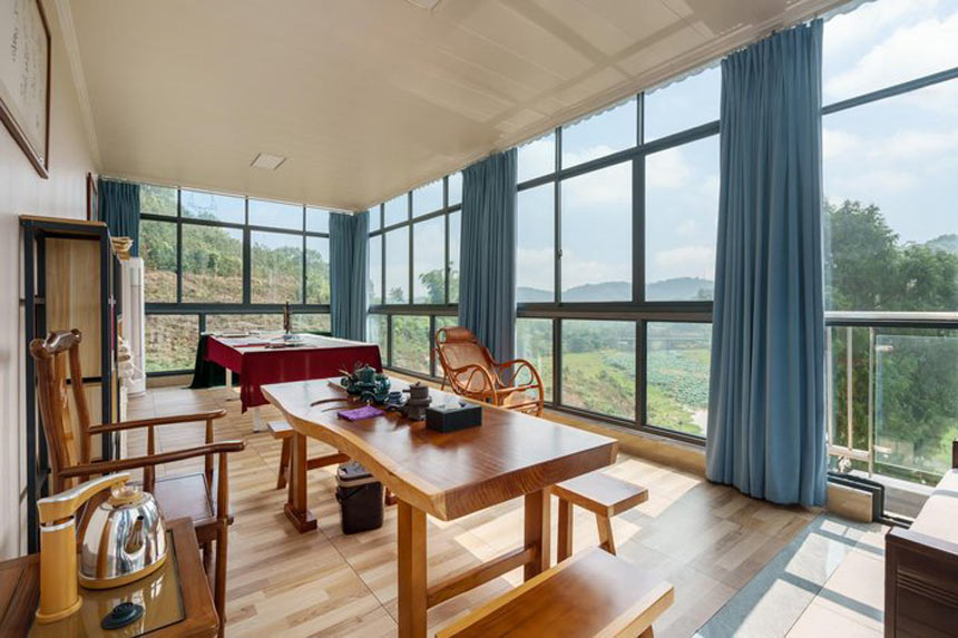 “临湖雅舍”位于重庆高新区(原沙坪坝区)曾家镇虎峰山景区莲花湖畔,四面环山,临湖靠水,视野开阔,四季美景,春看花、夏赏月、秋采果、冬挖藕,可钓鱼,可玩耍。临湖雅舍空气清新,天然氧吧,是主城周边难得的乡村高端酒店,设有阳光客房、全景会议室、全景茶室、会客厅、棋牌室、K歌室、品茶品酒区、文化活动区,儿童玩耍区、厨房、餐厅等,全屋配有空调、地暖,是朋友、家人、单位聚会的理想之地。 欢迎您莅临雅舍,看山看水看美景,品茶品酒品美食,共享大自然的生活。