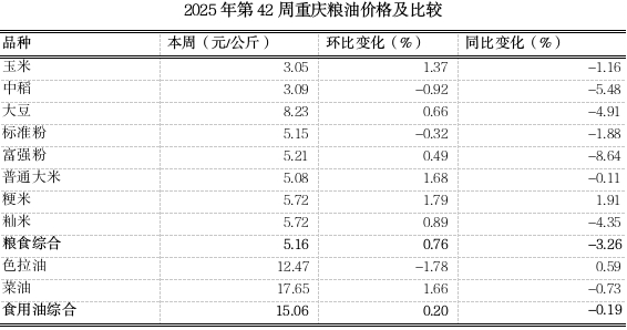 一、粮油监测品种总体价格环比平稳、同比下跌 根据市农信中心对我市各区县农贸市场10个主要粮油品种价格监测,第42周(2025.10.13~2025.10.19)重庆粮食均价5.1...