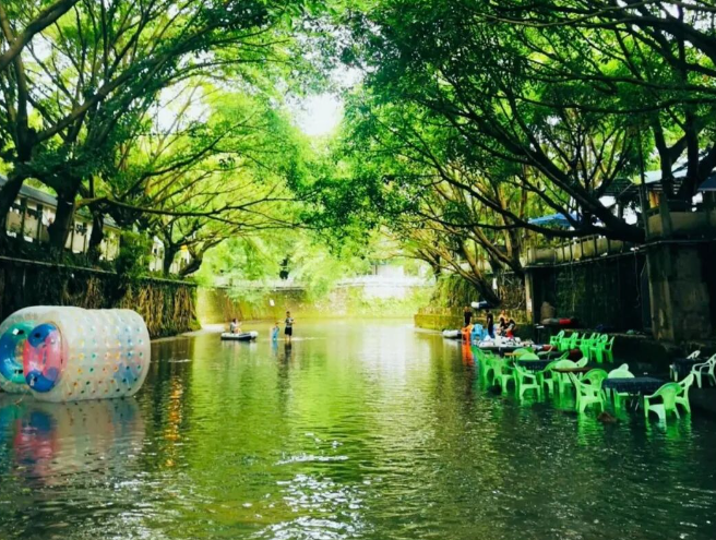 一到夏天,这里就成了“水上乐园”。大人小孩提着水枪、拿着小网兜,在水里追逐打闹,水花溅起时满是欢声笑语;喜欢安静的人则搬个小凳子坐在水中,把脚泡在凉丝丝的水里,手里拿着鱼竿钓鱼,静待鱼儿上钩;胆子大些的还会租上皮划艇,顺着水流慢慢划,看两岸的古镇风光缓缓后退,风里都是水汽的清新。