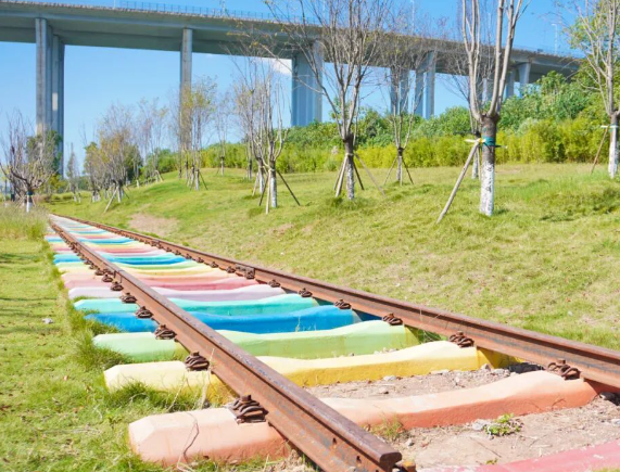 钓鱼嘴战备码头码头与江面、过往船只构成一幅完整画面适合驻足观江景、拍复古风照片彩色轨道如被打翻的调色盘随手定格都是江景与彩轨相映的清新画面