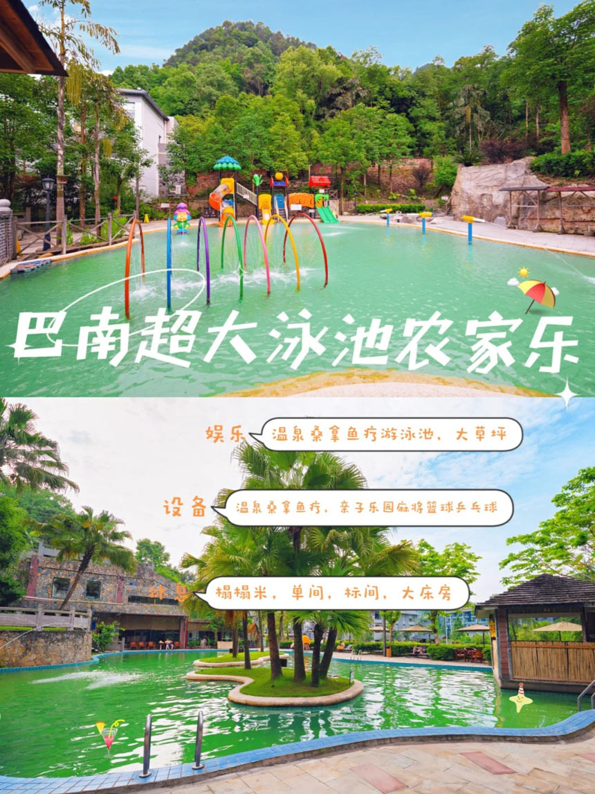 他们家的泳池和温泉是特色,不过我建议白天的话去泡温泉,傍晚的时候再去泳池玩,不然泳池那边太阳大估计会晒脱皮,有鱼疗桑拿房,环境也很好,关键是还有亲子乐园,里面海洋球滑滑梯,简直不要太爽!户外面积也很大,公司团建活动、篝火晚会、求婚的话都是可以,适合家庭亲子游、公司团建!