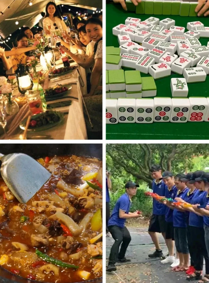 吃饭的话是十人一桌配餐(在餐厅),吃完饭可以去打打麻将,一堆人坐在一起边聊天边玩耍氛围很舒服!