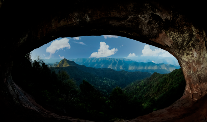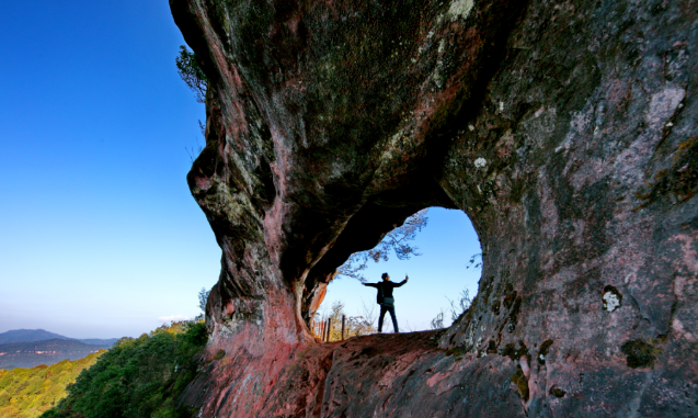 “天空之眼”是这条徒步路线上最为璀璨的明珠在插旗山顶西北200米处海拔1300米的地方有一个天然形成的大山洞宽约10米,高约5米 当地人称之为“穿洞岩”