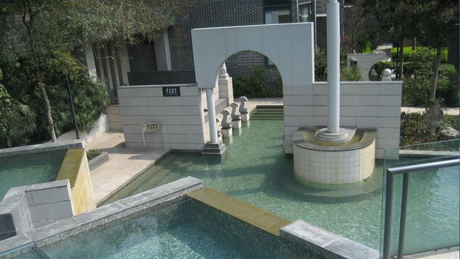 各具特色的临河休闲观景小园林,户内户外相同的温泉泡池和联排别墅客房融为一体。