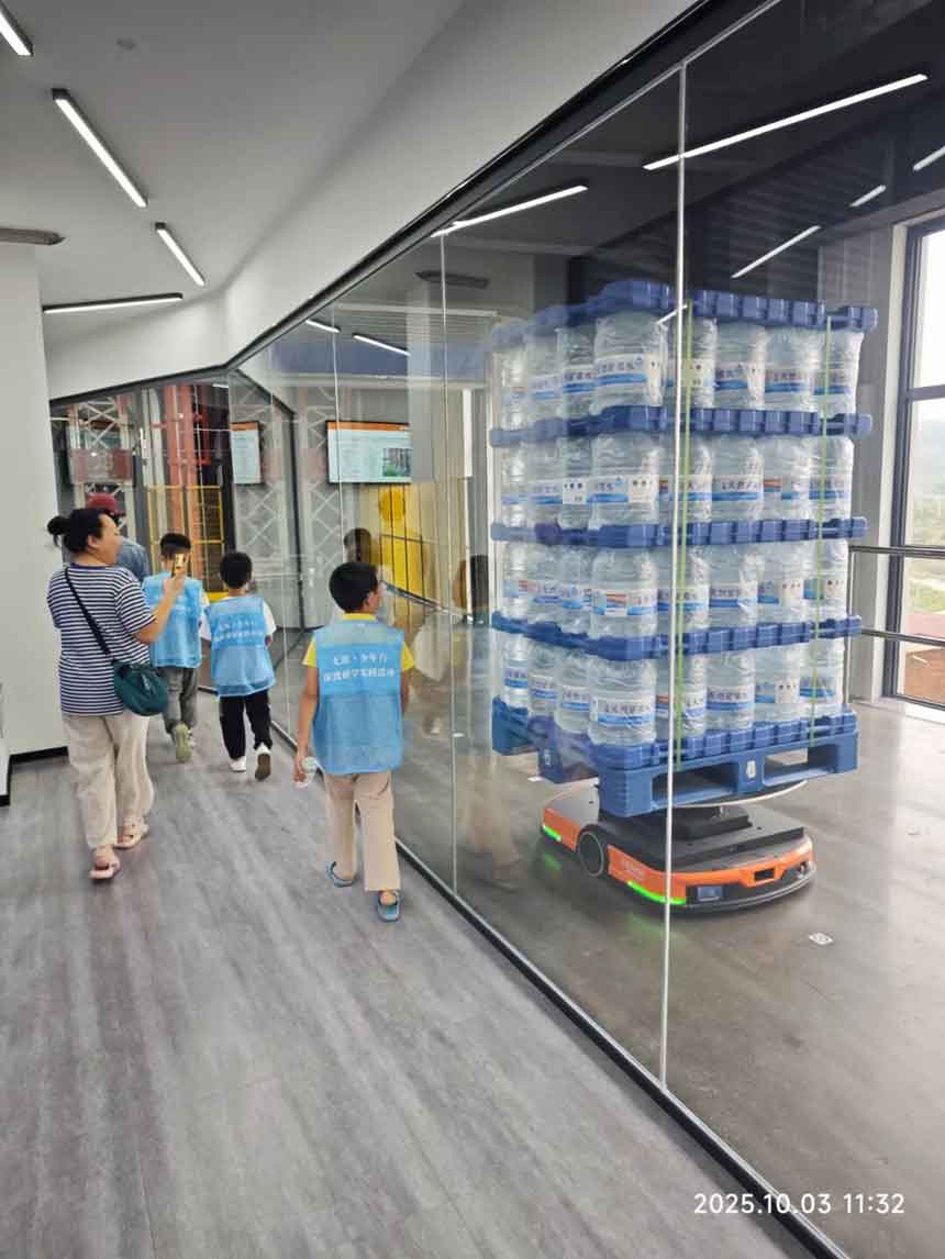 走进厂区,映入眼帘的是近3万平方米的现代化智能空间。全自动化桶装与瓶装生产线高效运转,从水源过滤、灌装封口到贴标装箱,全程“零接触”,每一滴水都在严密监控中完成它的“瓶装之旅”。孩子们可以亲眼见证,天然泉水如何经过科技赋能,变成手中那瓶值得信赖的“宜简水”。