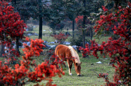 清晨登顶悬空玻璃廊桥,看云海在彩林间翻涌,仿佛踏入仙境。 千野草场:火棘红海,野趣天堂 红艳艳的火棘果挂满枝头,与金黄的草甸、黛色的石芽相映成趣,宛如闯入童话世界。