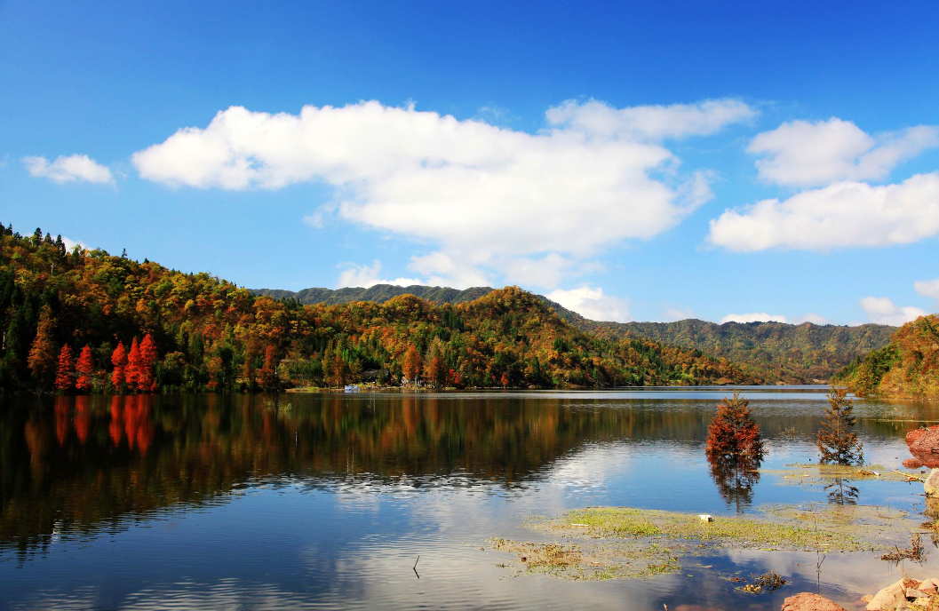 太阳湖:湖光映彩,惬意悠游 秋冬时节,湖周的彩林宛如一幅绚丽的画卷,倒映在如镜的湖水中。