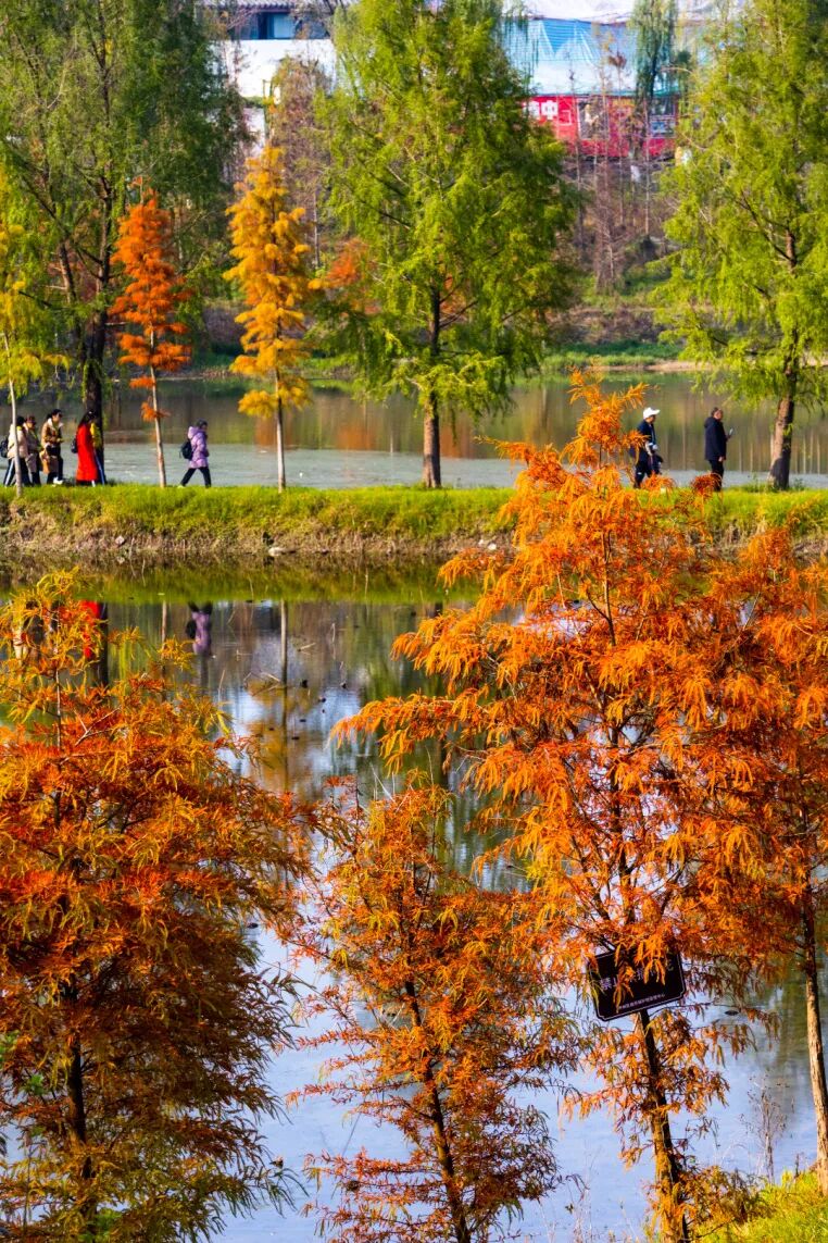 成片的水杉挺拔直立,深绿与金黄交错,阳光穿透枝叶,在湖面投下斑驳的光影;火红的叶片在蓝天下格外耀眼,仿佛点燃了整个湖畔。