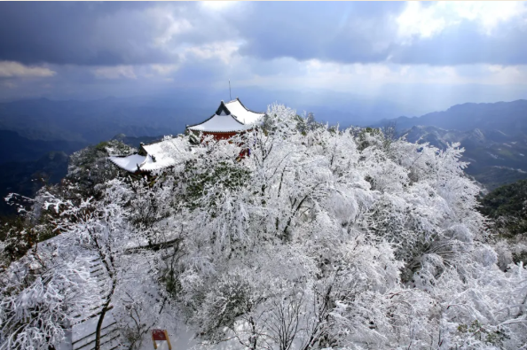 悬空的玻璃廊桥覆上一层薄雪,远远望去,就像一条银色的带子横跨山间。