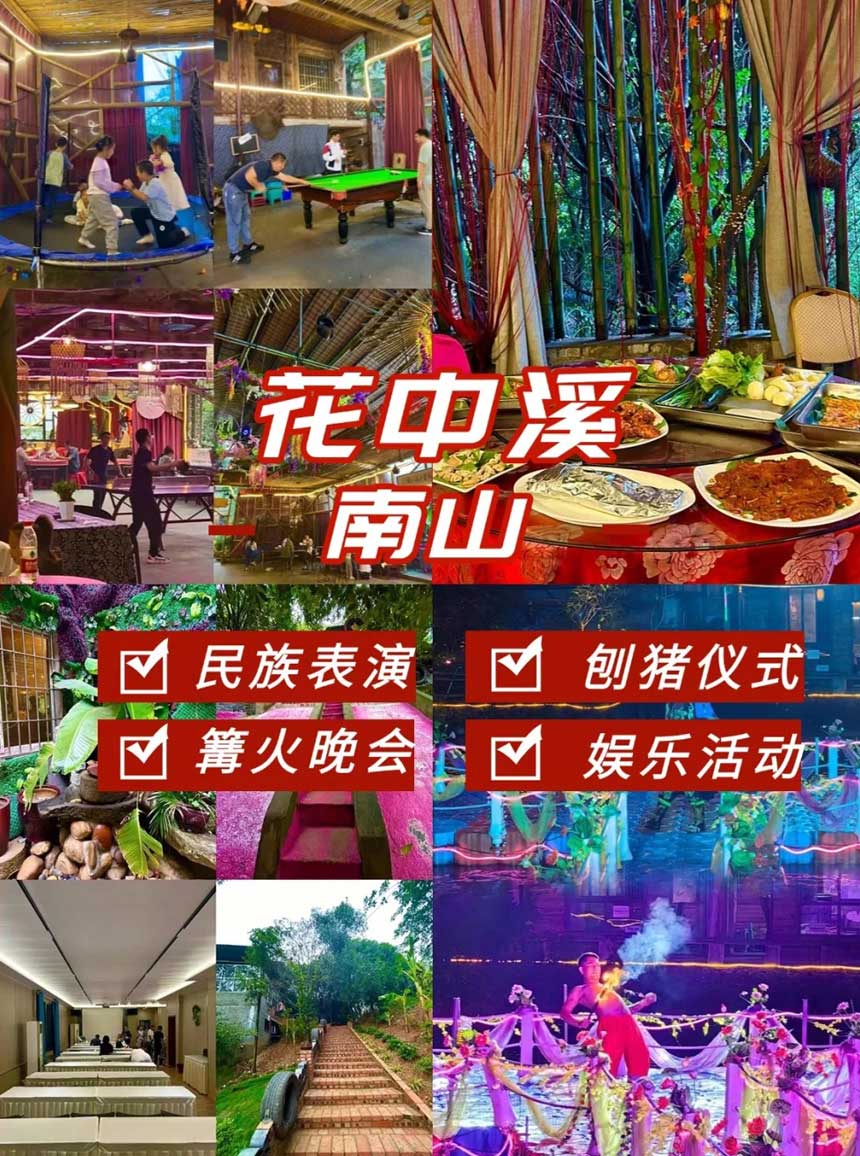 推荐理由:花中溪农家乐,绿植环绕,小桥流水,是团建聚会的绝佳选择!正宗刨猪汤,云南风情表演,如喷火和川剧变脸,让你一次玩个够!