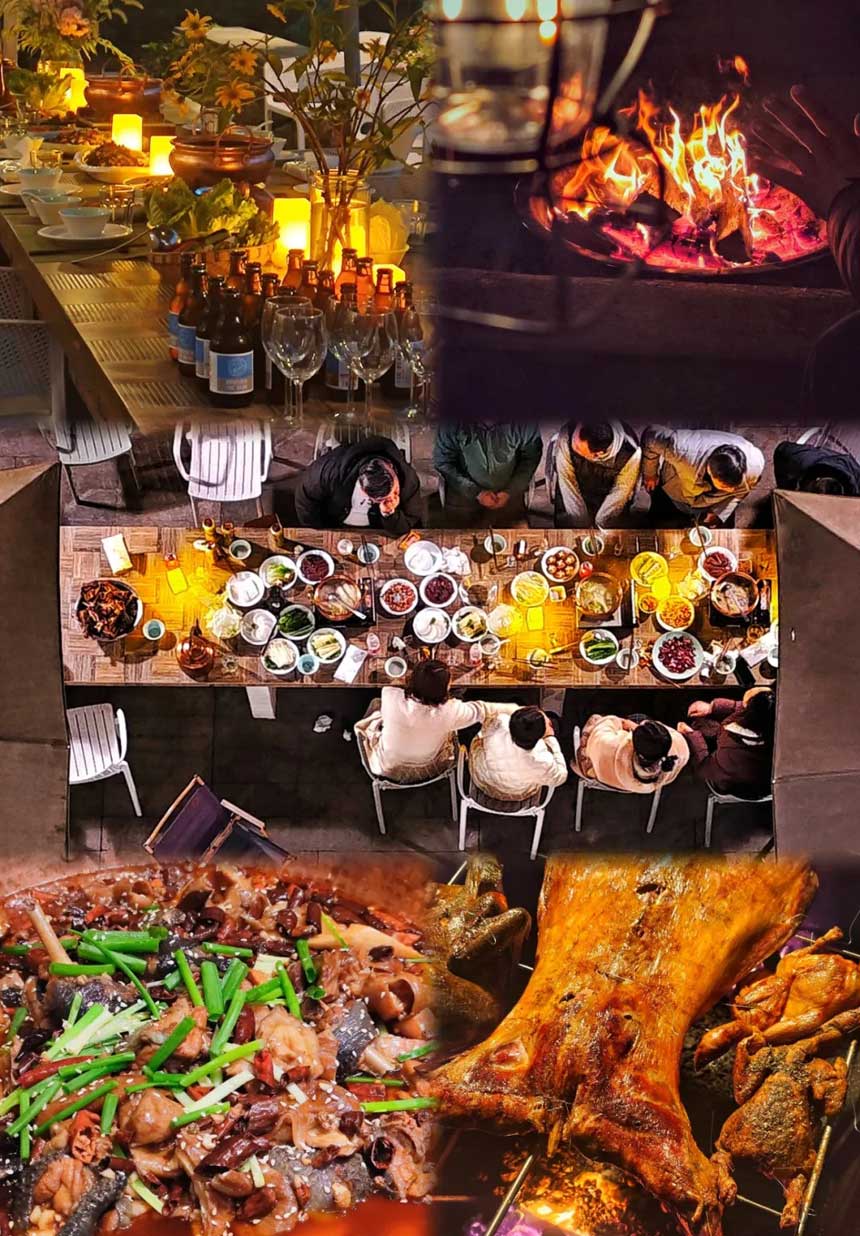 在自然与乡村的团年饭盛宴中,鸡鸭鱼肉样样不能少。 特色铜锅羊肚菌土鸡汤,养生美味,乌皮土鸡与羊肚菌搭配, 铜锅炖煮香气浓郁、营养丰富口感醇厚; 再搭配各种田园新鲜时蔬,特别适合中老年朋友口味~
