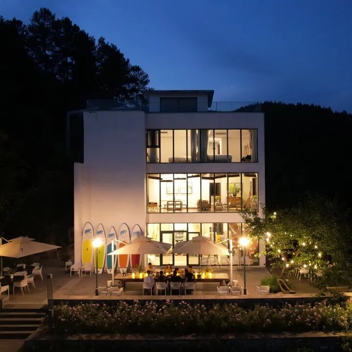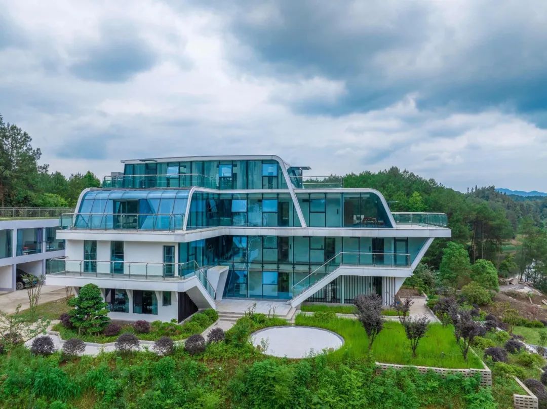 不知山外民宿 位于巴南区石龙镇金龙湖畔宛如隐匿在尘世之外的世外桃源。它三面环水,背靠青山仿佛是大自然精心雕琢的杰作民宿造型设计独特新颖宛若一艘停泊在金龙湖畔彩云之上的白色游船人们称之为“云上之舟