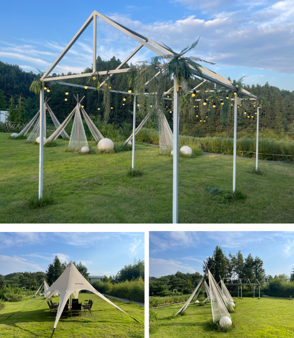 三栋建筑中间的大草坪是客人的心头好在这搭上一顶帐篷就好像来到了海边度假一般在草坪上野餐或是举办派对都是不错的选择
