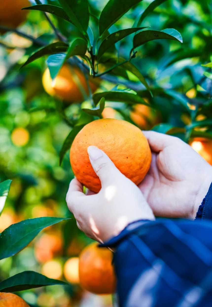 提着小竹篮进园采摘 亲手挑选饱满圆润的柑橘 指尖触到果皮的细腻纹理 摘下一颗轻轻剥开 橘皮之下是饱满多汁的果肉 掰一瓣进嘴 清甜的汁水瞬间在舌尖爆开 初冬的干燥感瞬间消散