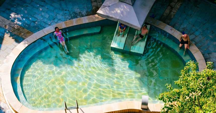 它背靠中梁山山脉 温泉涌流于中梁山脉末端地下2500米深处 有苍松翠竹,小桥流水 冬日泡汤不仅能驱寒暖身 还能舒缓疲惫,温润解乏