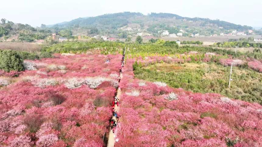 这一片红梅 不仅装点了冬日的山野 更成为激活乡村活力的重要载体 游客在赏梅之余 也能体验田园生活、感受乡土文化 红梅谷因而成为 永川农旅融合发展的一个生动缩影
