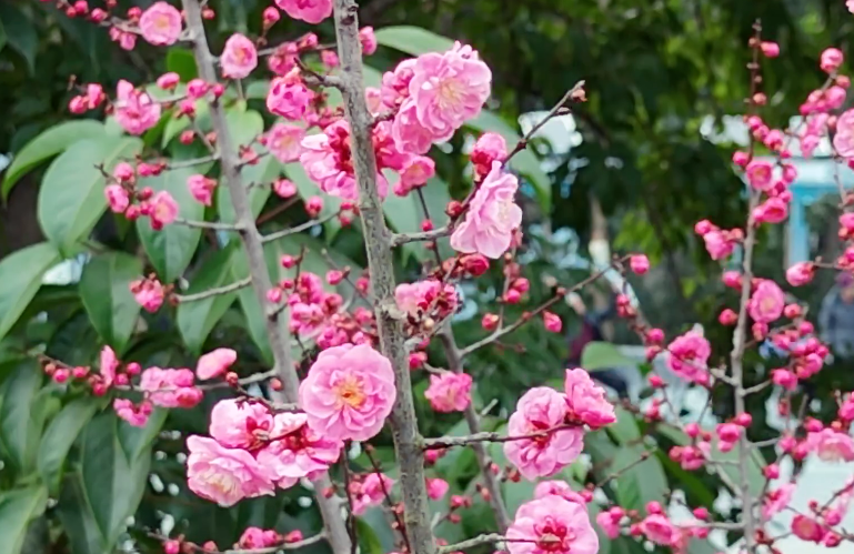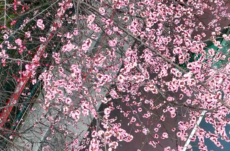 在公园篮球场周围一大片梅林正热烈盛开白梅:素净淡雅,像是落了一层薄雪粉梅:娇俏烂漫,是属于早春的温柔枝头繁花簇拥,幽幽暗香萦绕
