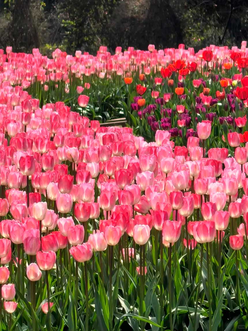 规模震撼:从荷兰引进28余种郁金香种球,近50万株盛放于约10000平方米花田,集中在百花岛、百寿园,层层叠叠如调色盘,视觉冲击力拉满