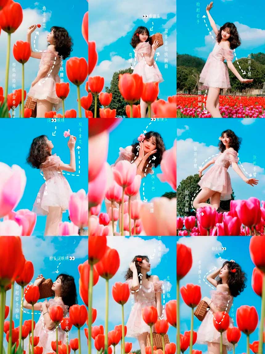 道具:草编包、草帽、复古报纸,或拿一支假郁金香(更环保),随手一拍都是氛围感大片,避免手部僵硬
