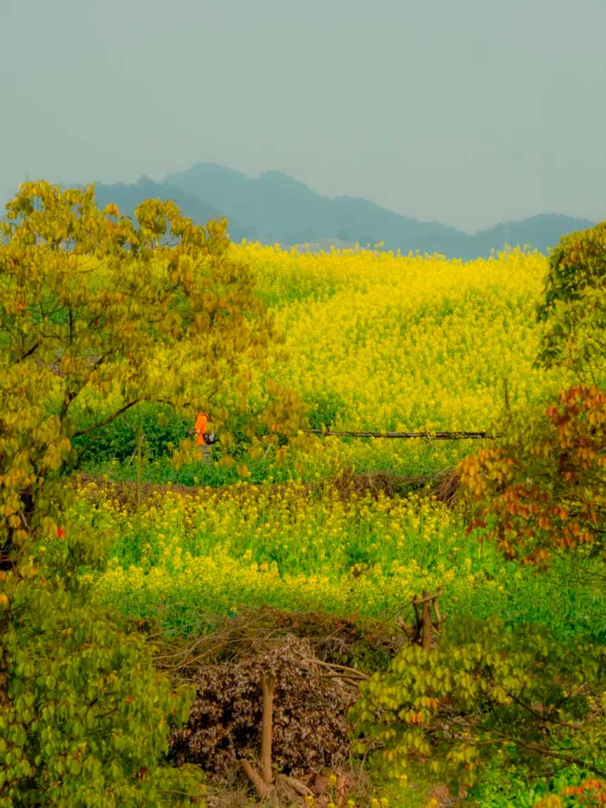 景区内200万株 油菜花次第开放 大片金黄铺展于田野之间 一簇簇、一丛丛、一片片 映衬着远山和白云 穿梭其间 仿佛是从画中走出来的