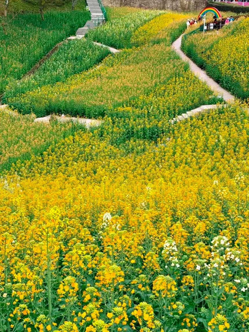 橙红、奶白、金黄 紫色…… 在溉澜溪体育公园 一大片五彩斑斓的油菜花交织错落 构成了一幅浪漫多姿的春日画卷