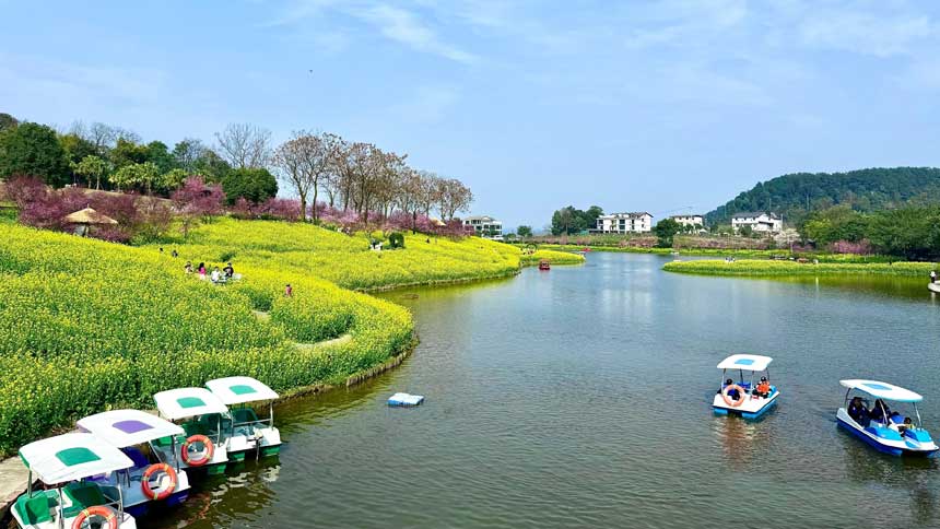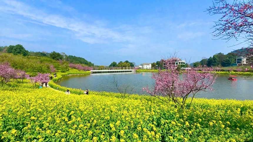 巴南云林天乡的油菜花开了哟看油菜花,云林天乡景区白鹭源休闲山庄赏油菜花来这儿~还有游船、烧烤、露营…安排!白鹭源休闲山庄有湖景房直接在房间里面可以赏花