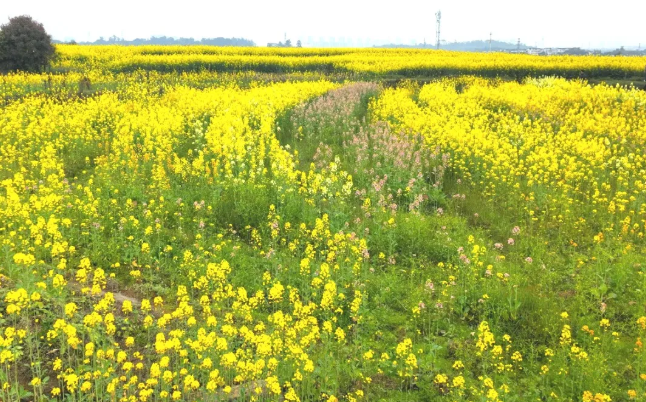 刚拐进新民村的乡间小路 城市里的车流声就被甩在了身后 迎面扑来的,是裹着青草气的花香 路两边的田垄里 油菜花已经开得铺天盖地 顺着缓坡、沿着田埂 600亩的金黄,一眼望不到头