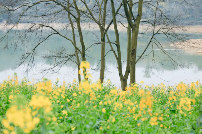 这里是沙坪坝中梁镇 青山绿水间藏着超大片油菜花田 它就是斐然湖 来此赏花超级治愈 随便怎么拍都出片