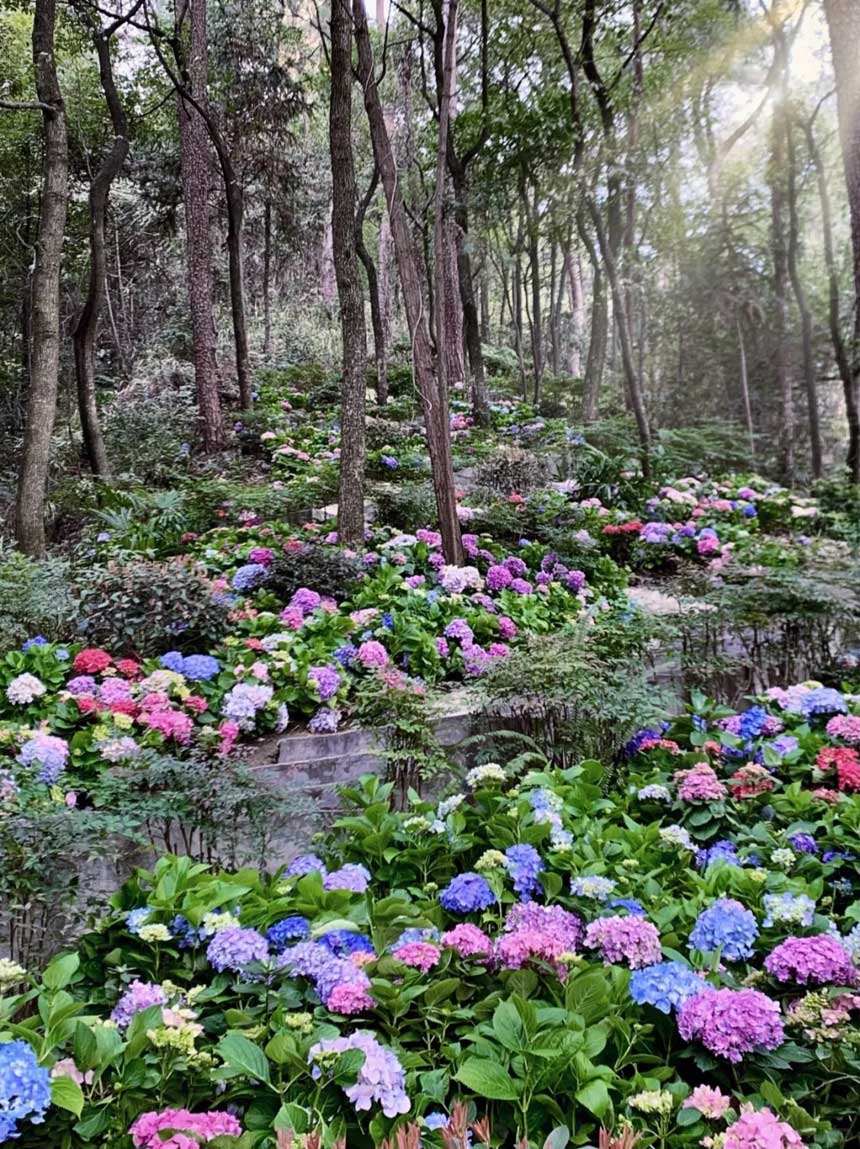南山上盛开的不止是樱花 除了满园郁金香和山茶、红梅 本周末大金鹰绣球花热烈盛放 像闯进了“爱丽丝”森林秘境 前来打卡注意避开拥堵路线和时段哦
