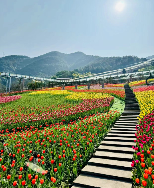 亮点:沙坪坝红岭溪谷百万株郁金香,红、粉、黄、紫交织成绚烂花海。景区除了赏花以外,还有超多趣味游乐项目供大家游玩体验,云顶爬山车、花海小火车、飞天魔毯、玻璃漂流...在山水间感受速度与激情,承包大家的欢乐时光!