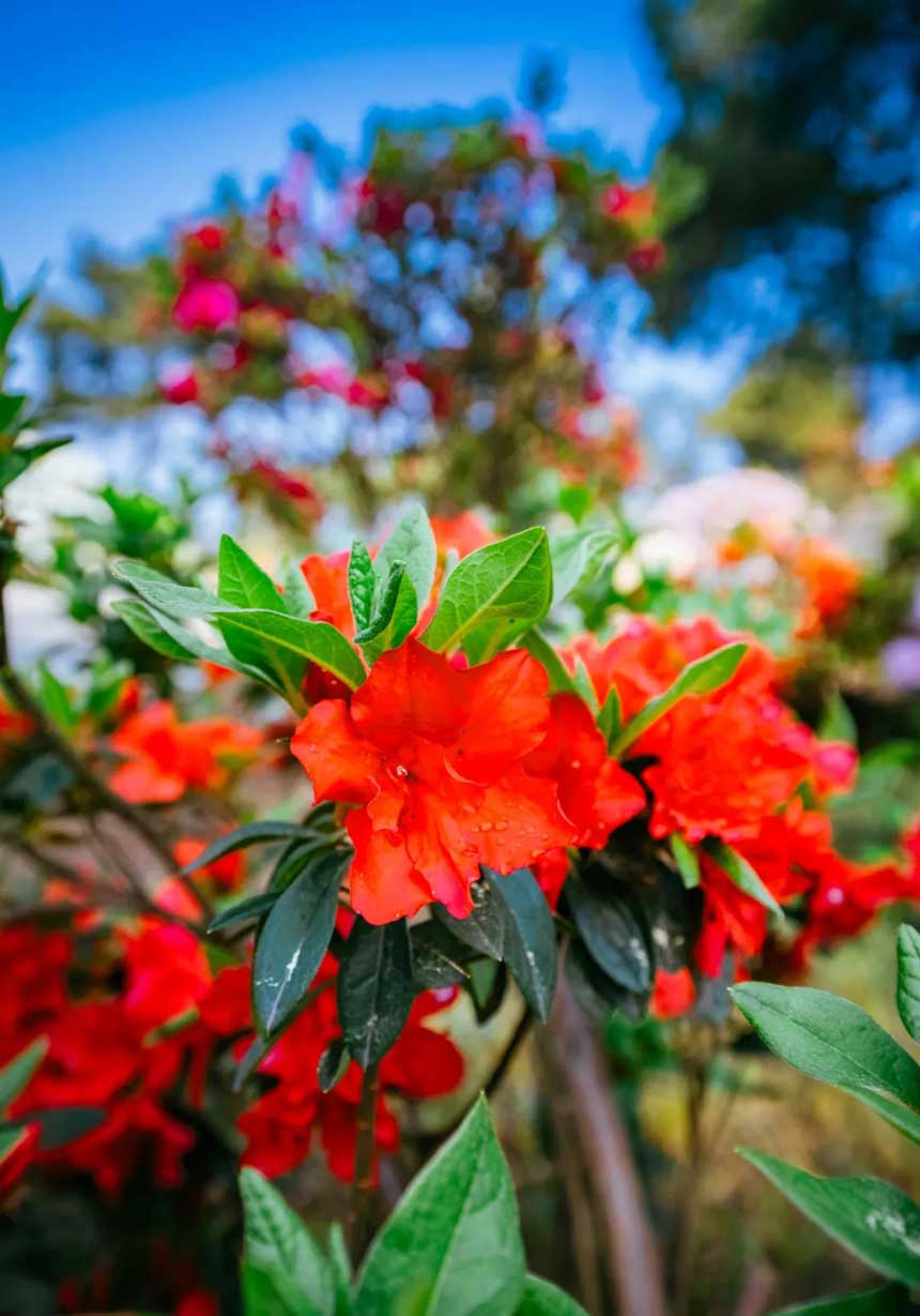 依山而建的杜鹃园,5万多株杜鹃随山势高低错落。沿着曲折往复的石板小径拾级而上,花影迷离,草木繁茂,仿佛误入了童话里的爱丽丝仙境。