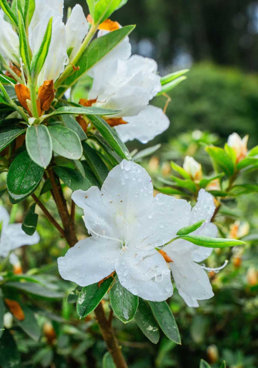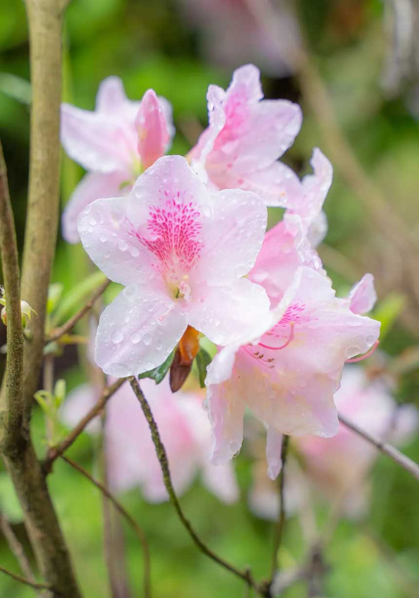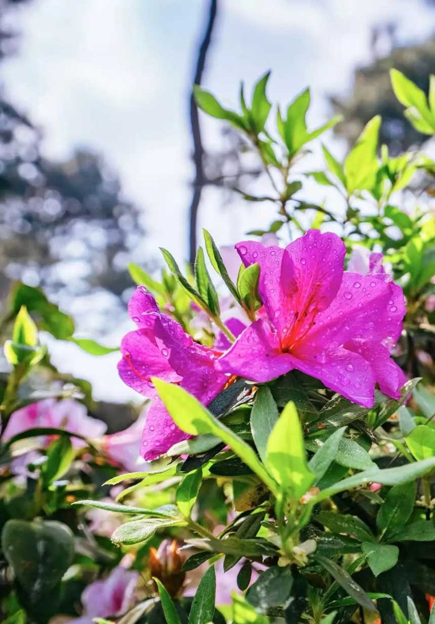 这里的杜鹃从不挑天气。晴天时,阳光为花瓣镀上一层金边,色彩浓郁得化不开;雨后,花朵被洗去浮尘,晶莹的水珠在花蕊颤动,更显空灵柔美,娇艳欲滴。