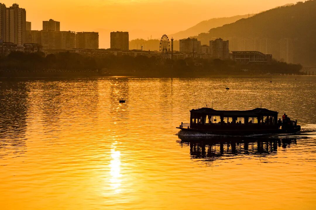 到了傍晚,阳光一照,湖面碎金闪烁,随便一个转角都能拍出大片。