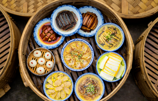 松溉“九大碗”的九道菜肴 均以竹蒸笼蒸制3-4小时 搭配凉菜等配菜 传统九道菜包括头碗大菜 排骨酥肉汤、干盐豇豆土鸡汤 甜酸鲫鱼、酸萝卜鸭汤 香糯猪肘、夹沙肉、荷包蛋和烧白