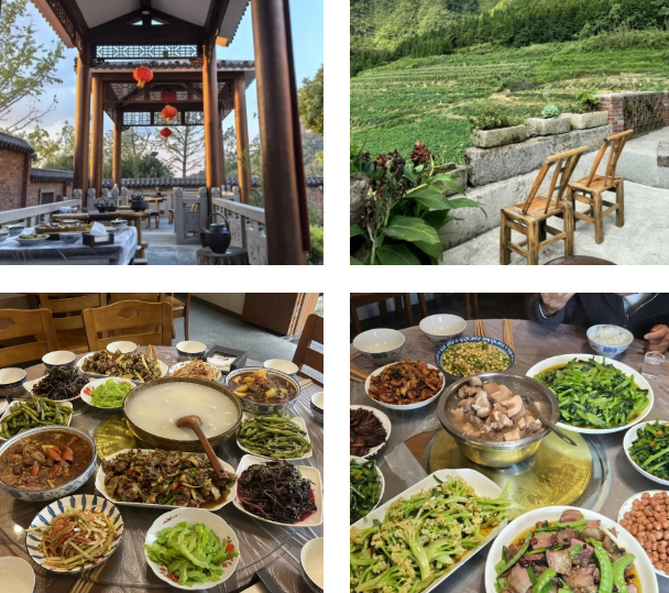 传承百年书香底蕴的古雅庭院,设有流动图书点、茶室,推窗便是满目绿色山脉,视野开阔。农家饭讲究食材本味,柴火慢炖的土鸡汤、现摘时令野菜,每一口都是春天的原香。