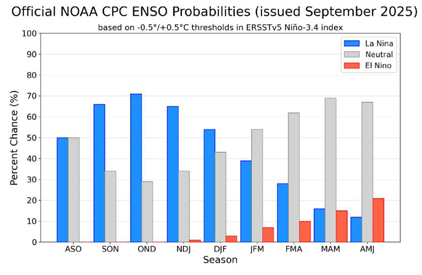 NOAA给出了未来几个月内,ENSO中性可能会转变为La Niña,10月至12月2025年期间La Niña发生的概率为71%,看到没?概率高达71%,,这说明什么?