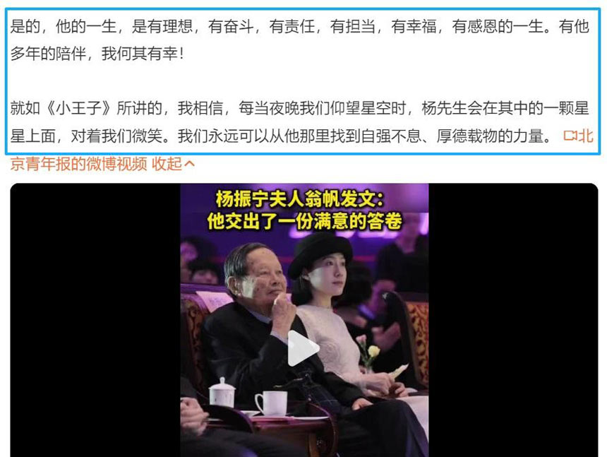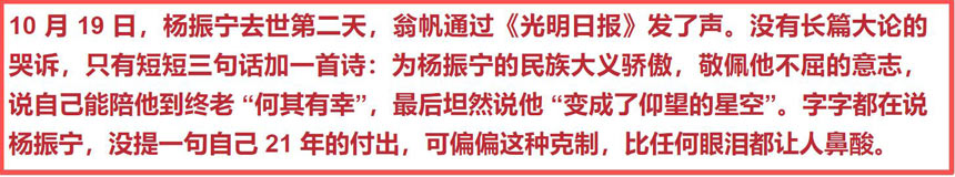 杨振宁去世第二天,翁帆就通过《光明日报》发声。