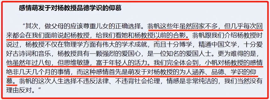 翁父也曾描述过,翁帆对杨振宁的极度仰慕。
