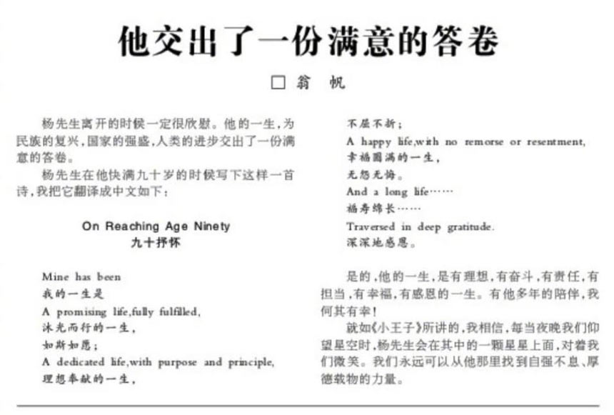 翁帆在前文中写到,杨振宁的一生为民族复兴,为祖国强盛,甚至为人类科学的进步,都交上了满意的答卷。