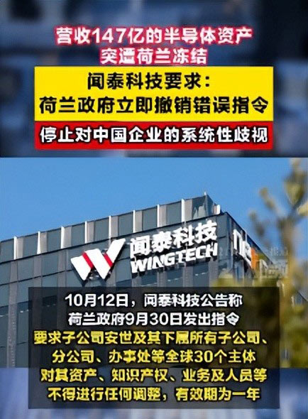 荷兰政府突然掀桌子了。 理由是安世半导体存在"严重的治理缺陷",所以要临时接管控制权。 安世半导体是谁?闻泰科技,中国的。 巧了不是。