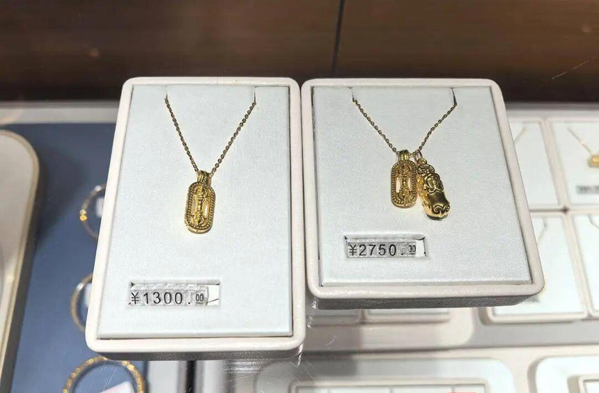 价格方面,老凤祥专柜推出多款“克重轻、价格亲民”的黄金饰品。销售人员介绍,一款“金刚杵”造型的足金挂坠搭配银链,售价1300元,近期销量火爆。另一款“金刚杵”叠加“貔貅”造型的双挂坠搭配银链,售价2750元,叠戴效果吸睛。“这款性价比高的黄金饰品很受年轻女孩欢迎,她们自己戴一个坠子,另一个挂坠送妈妈。”销售人员笑着说,这款产品既满足了年轻人对时尚的追求,又体现了孝心,成为近期热销单品。