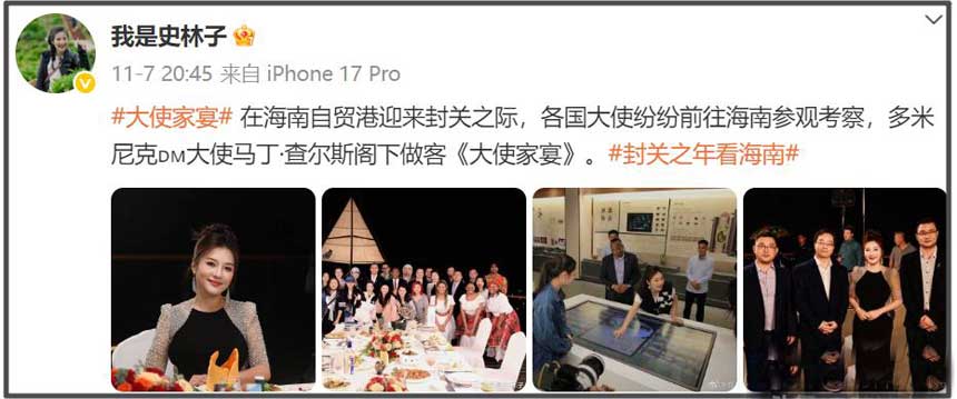 据悉史林子曾录制一档《大使家宴》的节目,但她私下和朋友对大使开黄腔,还相约去国外抽违禁品,疑似涉嫌违法。