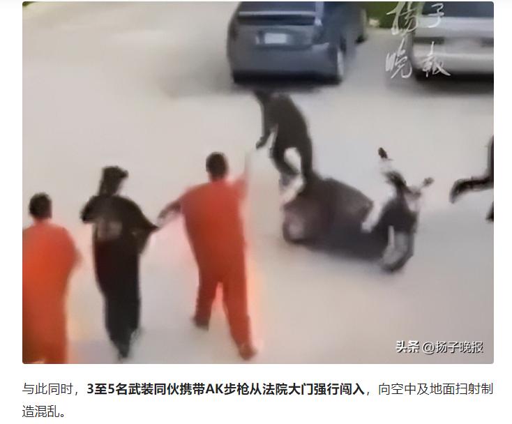 现场流出的画面中,还显示有警察遇袭后趴在地上躲避,反应迟缓,给囚犯留下跑路的机会。