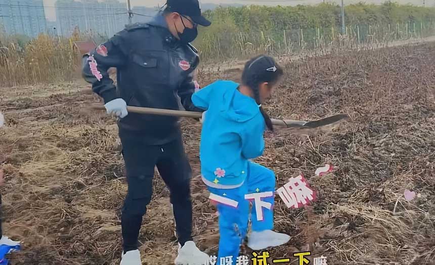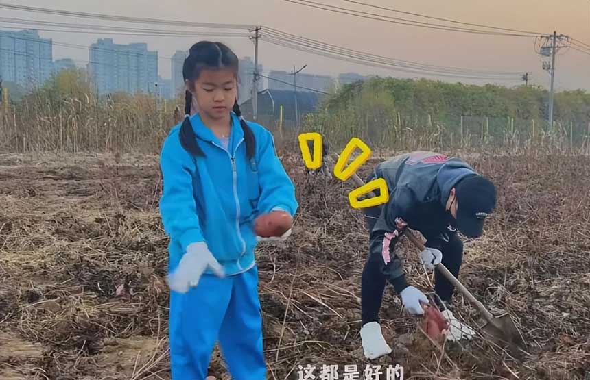 他带着孩子一起挖红薯、白菜,体验田园生活,父女俩干的十分起劲。