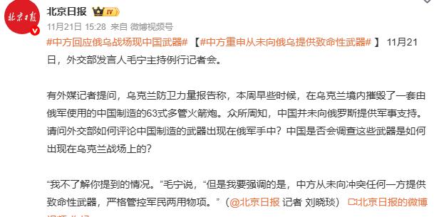 突发特讯!中国外交部回应“乌称摧毁中国制造武器”:中方从未向冲突任何一方提供致命性武器,引发全球高度关注