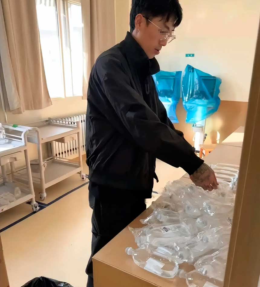 只见他完全无视医院最基本的无菌原则,如同进出自家厨房一般,随意闯入那个就连家属都被严厉禁止靠近的配药室。那里存放着病人的救命药,需要极高的洁净度。然而,这个连口罩、帽子、手套全都没戴的男人,就这么十分自然地抓起了输液瓶。