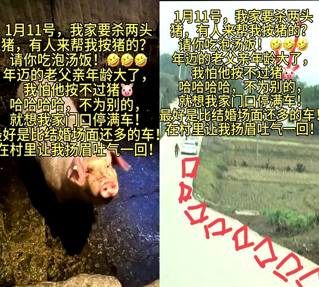 事情很直白:1月9号,合川一个叫“呆呆”的姑娘随口发了条视频,家里11号要杀年猪,喊人来按猪,说不准哦还能把村口车位停满。